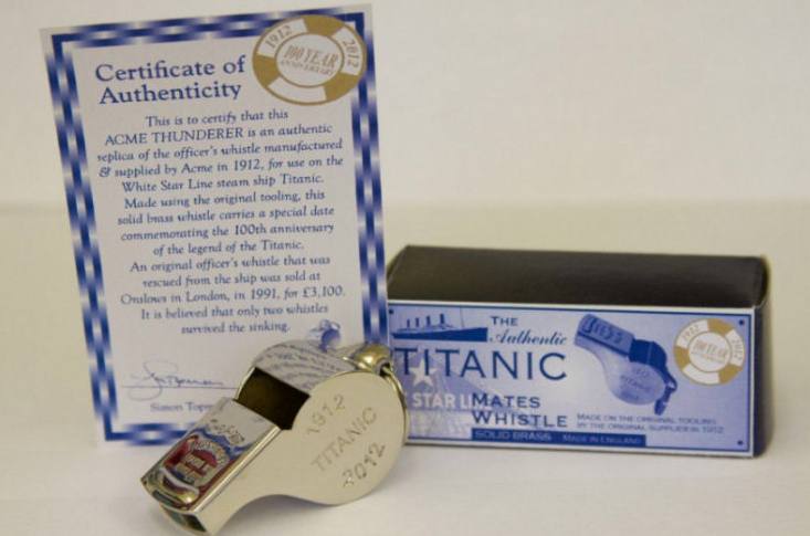Le véritable sifflet Acme utilisé à bord du Titanic par la compagnie maritime White Star Line en 1912.